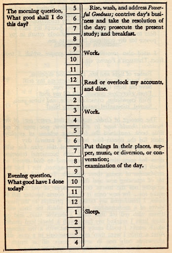Ben Franklin’s Daily Schedule Posted on February 13, 2012 by Tony Caselli So, I wonder if I tried to follow this for a week, what would happen? Aside from the fact that I’d immediately be re-arranging it because of rehearsals and kids? Either way, the questions of the day seem like a nice way to prioritize. Share this: Click to share on X (Opens in new window) X Click to share on Facebook (Opens in new window) Facebook More Click to email a link to a friend (Opens in new window) Email Click to share on LinkedIn (Opens in new window) LinkedIn Click to share on Reddit (Opens in new window) Reddit Like Loading...